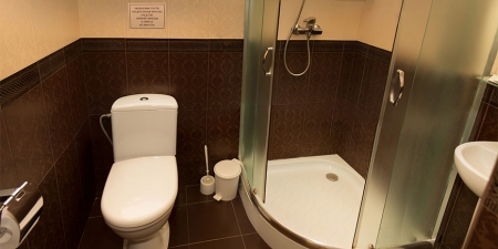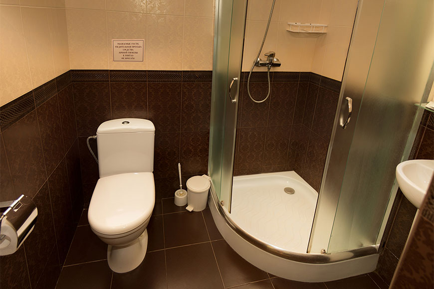 В ванной комнате – душевая кабина, туалет, туалетное зеркало, фен, предметы гигиены.